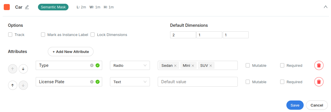 可変(Mutable) - トラックにのみ適用されます。チェックされている場合、同一オブジェクトの異なるフレーム間で属性値が変化することを許可します。例えば、車はフレームによって遮蔽されることがあるため、そのMutableプロパティはTrueに設定すべきです。しかしナンバープレートや車種、色などはオブジェクト固有であるため、これらのMutableプロパティはFalseに設定すべきです。