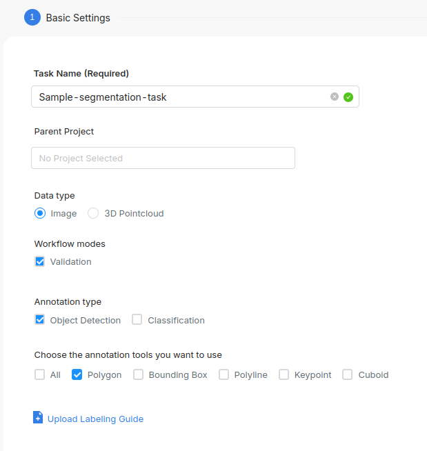 各データバッチはアノテーションモードで開始し、完了モードで終了します。要件に合わせてここに他のワークフローモードを追加できます。 *この設定は後で更新できないことに注意してください。*