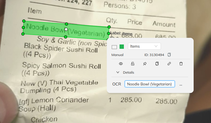 Detect lines - 이는 모든 텍스트를 줄(line) 형태로 감지합니다. 문서나 인보이스 등 텍스트가 주로 줄 단위로 작성된 항목을 레이블링할 때 적합합니다. 또한 이 텍스트에 할당할 레이블과 텍스트 값이 저장될 속성을 선택해야 합니다.