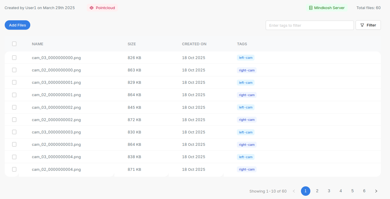 All your raw data - including images, point clouds and videos are managed through datasets. You can add tags to each file in your dataset to organize it into different subsets.